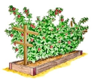 As raspberries grow up you want to plant it by a fence or create a support structure for it to grow upon. If you’re planting it by a fence, make sure to attach a trellis, or some type of wire structure.