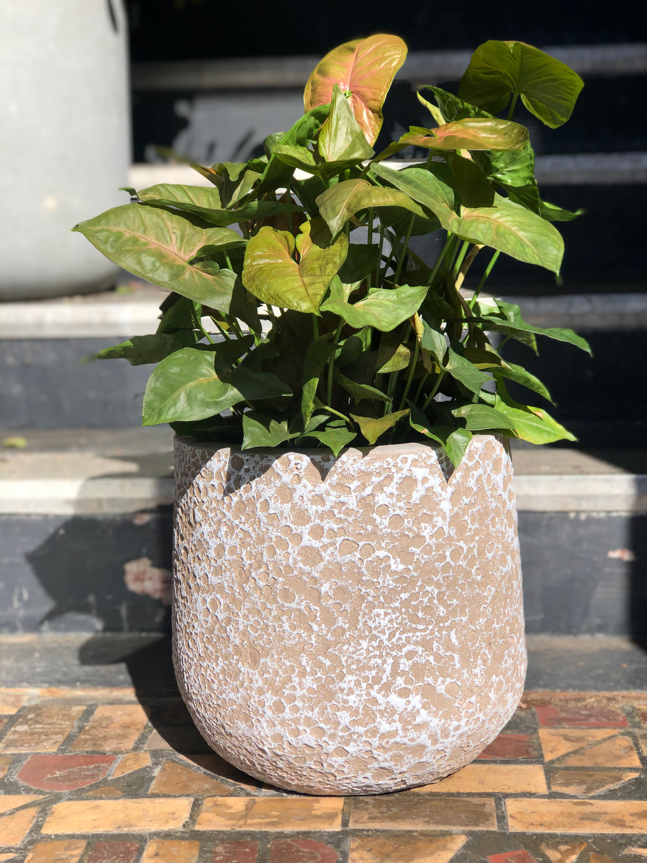 The Sea Foam is a glazed terracotta pot that’s had an acid wash. What happens is that as the paint in the glaze is setting the acid eats at the paint. They are then jack hammered on a machine and then hand polished, which gives them a really unique finish – so unique that no two pots are alike, each one is different. They’re called Sea Foam because how they are treated makes them look like the way the ocean looks after a wave has broken and the foam spreads apart in patches.