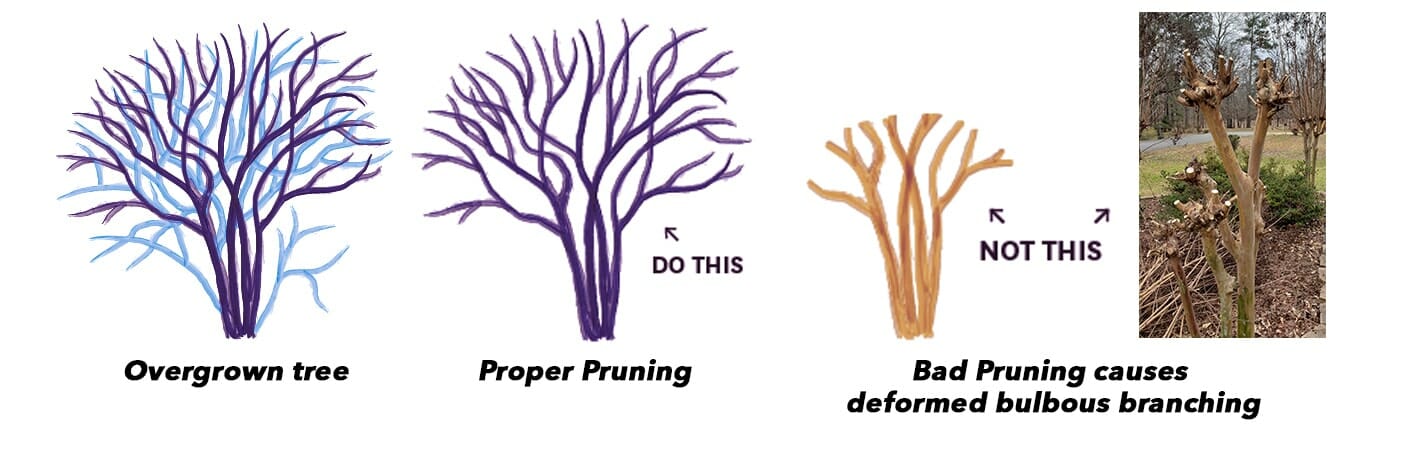 Crepe myrtle pruning should be done with much care as to avoid crepe murder! Ugly deformed trees are created when the tree has been pruned to forcibly into a shape that it just can’t recover from. Too much is cut off and large, bulbous knobbly bits are leftover for new growth to form from. This can happen to other multi trunked branches such as Magnolias.