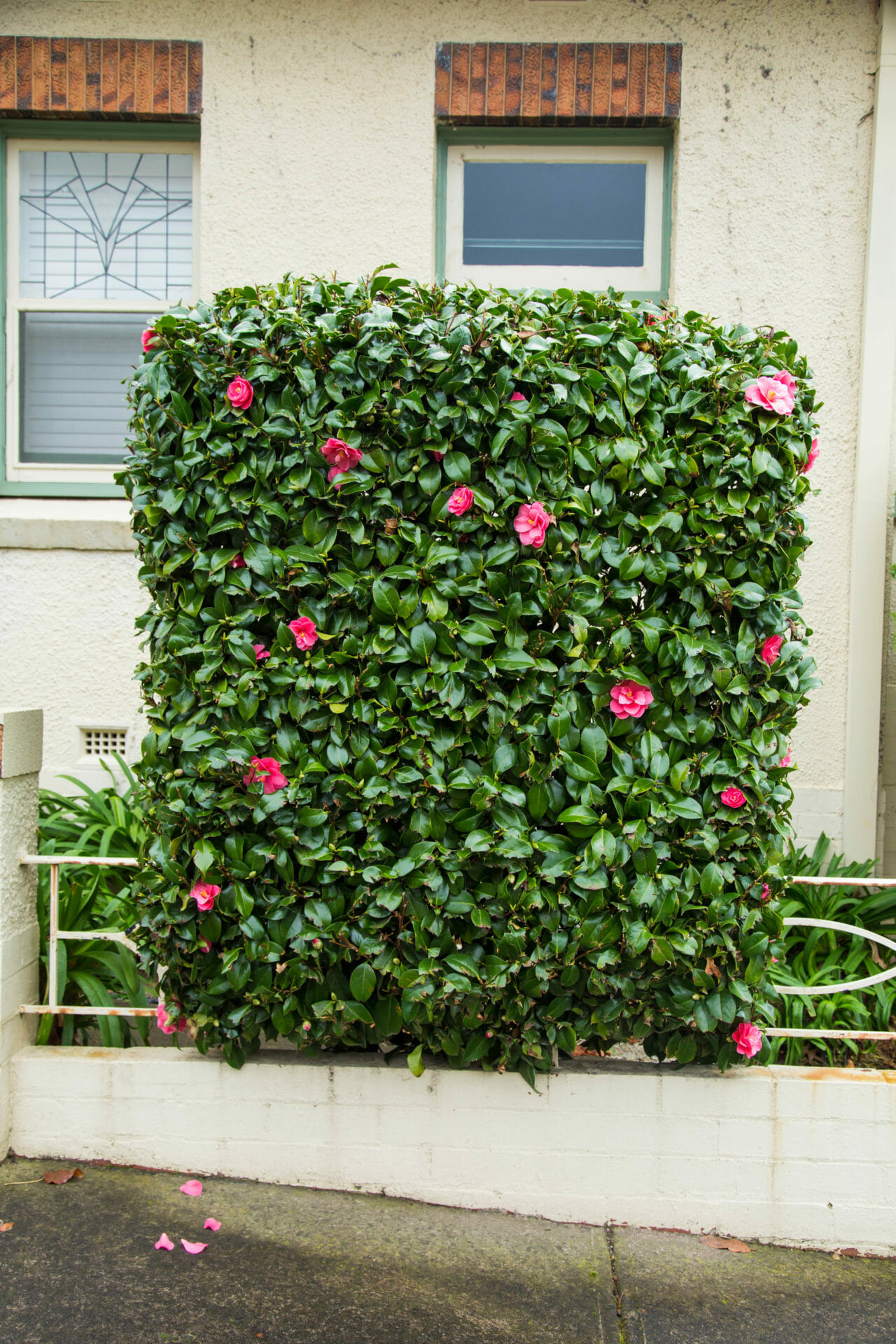 Trim the hedge just below the string if doing a pleached hedge or, for box hedging, just above the string! Some landscapers are known to use boards up against box hedging to get those immaculate straight lines.