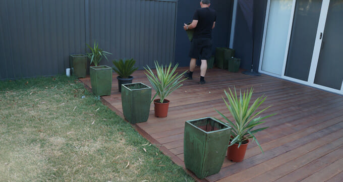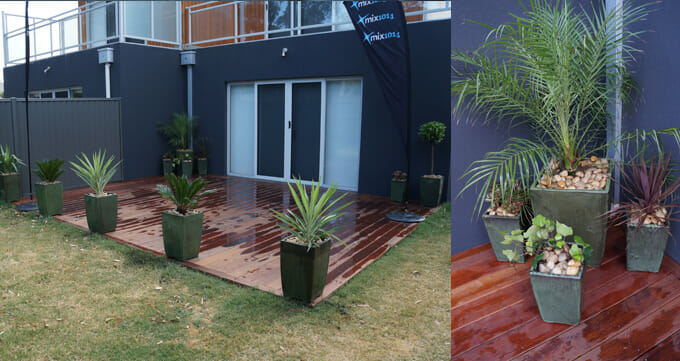 On Friday we did our last Garden Rescue Makeover with the Mix 101.1 Breakfast Crew. It’s been great fun, and thank you to all who entered the competition! The lucky last winner was Richard from Glenroy, who had a small bare back yard with some frazzled plants as it’s only greenery. The highlight in Richard’s yard was a new deck, so Chris decided to dress it up with potted plants to bring life to the otherwise bare outdoor space.