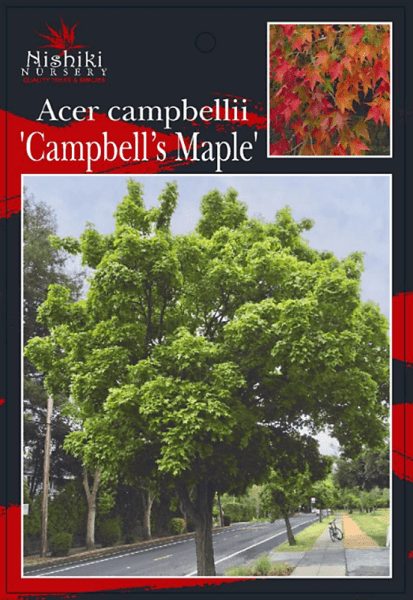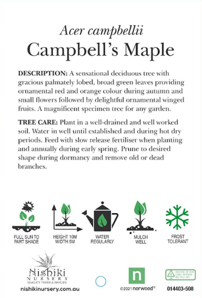 Campbell’s Maple is a tall, deciduous tree with green bark changing to brown smooth bark as it matures. Leaves are a broad, pentagonal shape that are lovely and light green before changing to orange and falling over winter. Can mature to 15 + m tall.