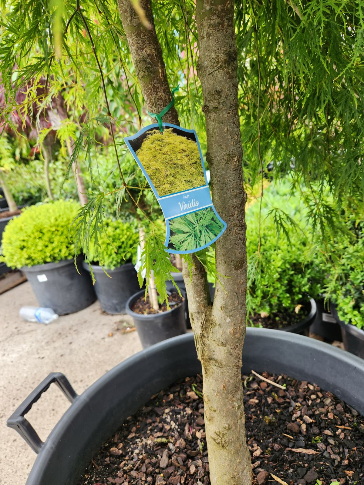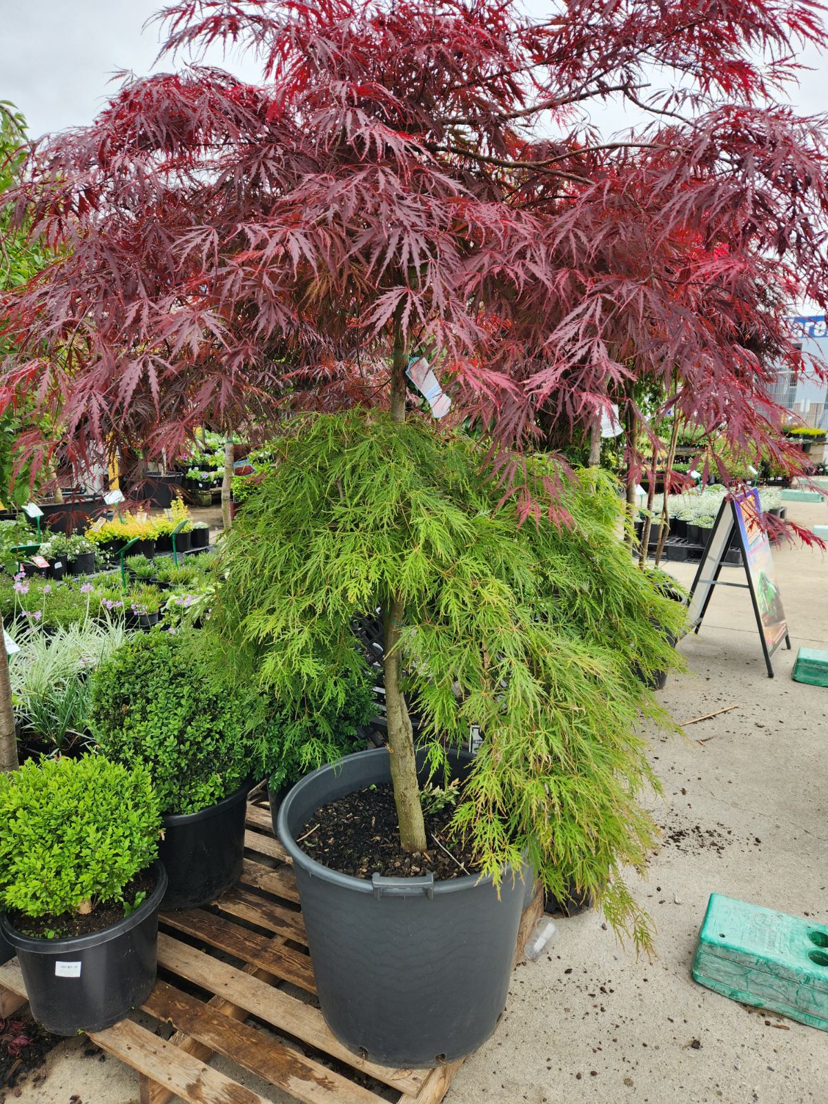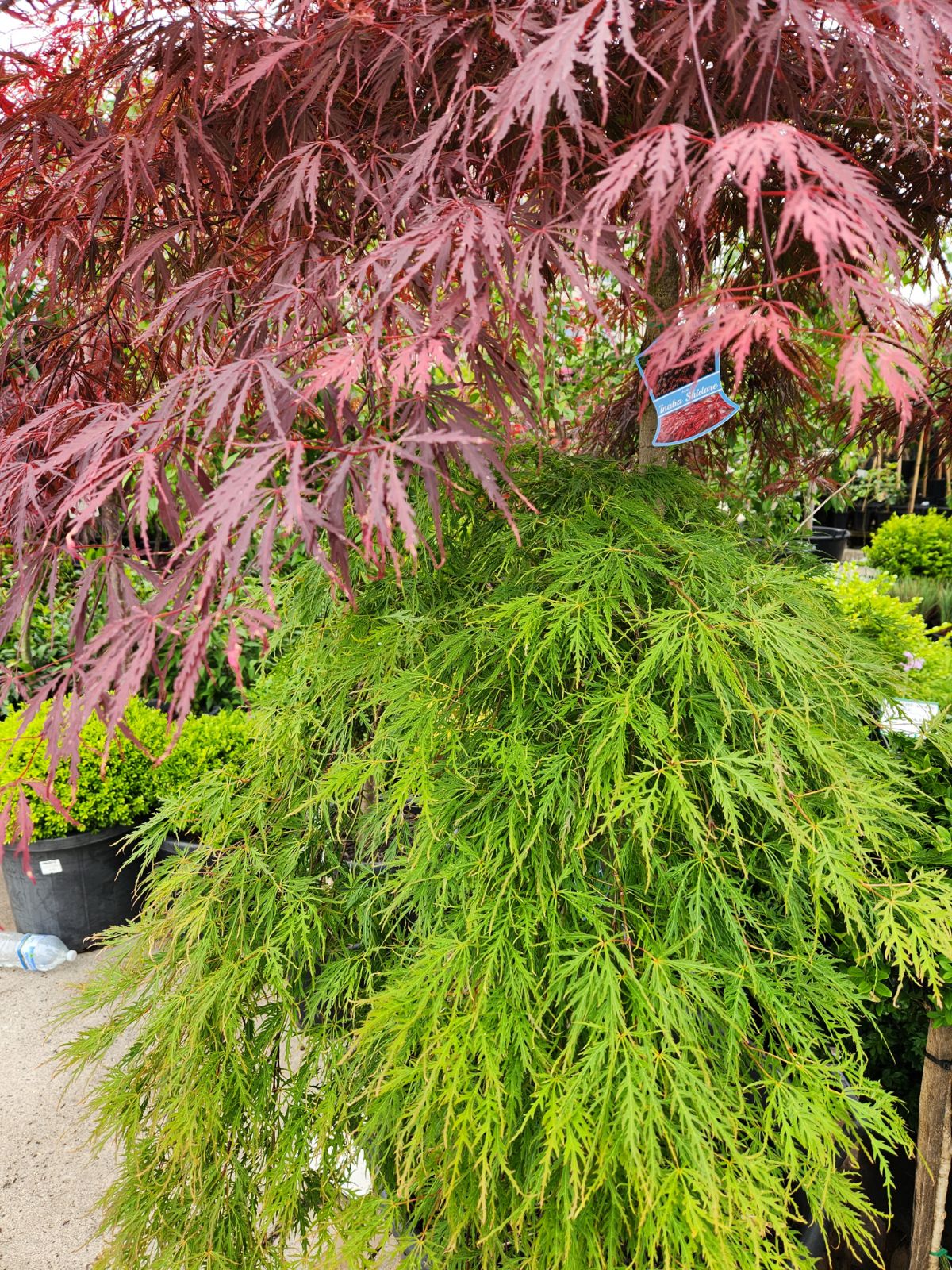 This stunning one-off variety of Japanese Maple is a double-grafted specimen, which is a mix between Inaba Shidare and Viridis Maples. It has all the same features as other Maples but is a knockout with two colours on one tree. The top graft of this stunner is a rich burgundy-red Inaba shidare and the lower graft is a pretty bright green Viridis.