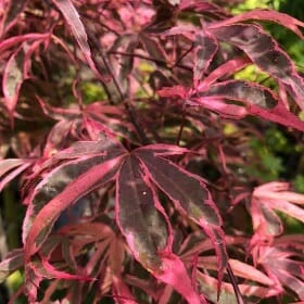 Shirazz is a bold Japanese Maple that displays variegated foliage ranging from a blend of pinks, greens, and creamy-white. Spring growth emerges with bright pink purple with light pink variegation. Autumn colors are tones of crimson red to scarlet. Shirazz is an upright grower at first, then becomes gracefully arching. Shirazz is fairly heat resistant. Grows to approximately 2.5m in height. A fantastic feature tree