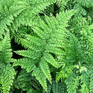 Upside Down Fern or Japanese Woodland Fern is an arching cut-leaf fern with fronds that rise from a thick, slowly creeping rhizome. The soft, lacy fronds have an upside-down appearance. An ideal woodland plant for moist, partly shaded areas. Semi-evergreen. Not for full sun areas.