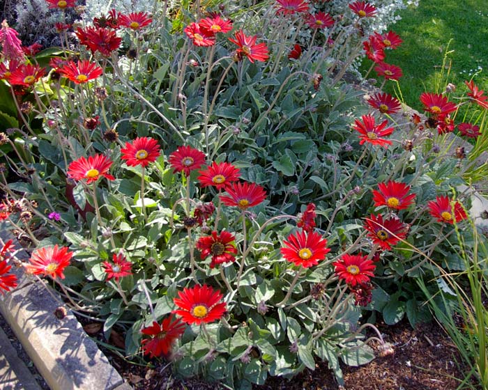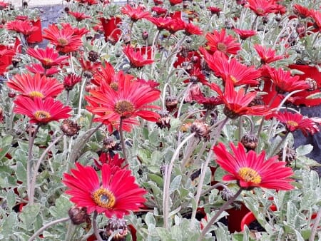 Arctotis Blood Red is a very hardy groundcover clumping plant with elegant silver foliage and large blood red long-stemmed flowers about 10cm in diameter. It is perfect for banks and rockeries, thriving in dry areas. Looks quite effective when used as a ground cover under trees and shrubs. It prefers a sunny position and can tolerate most soil conditions.