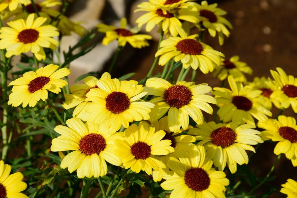 It has fine green bushy leaves with simple daisy flower heads with white petals and dark yellow centres.