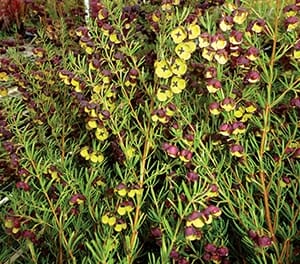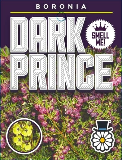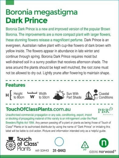 Boronia Dark Prince is an evergreen, native, fragrant shrub that produces purple bell-like flowers with yellow inner tones in late winter to late spring. Plant in well drained soil, in full sun or part shade. Mature growth: 1.3x1m