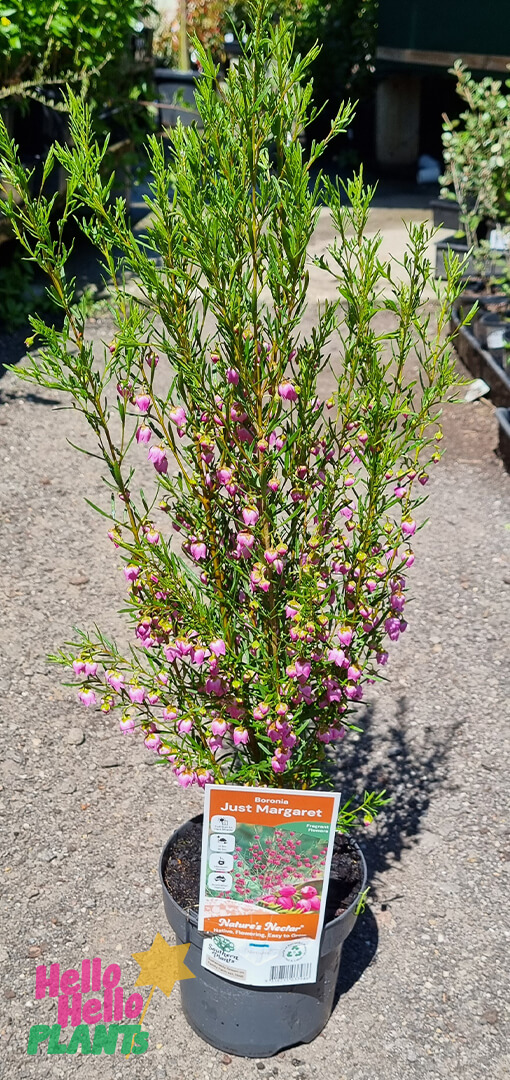 Boronia Just Margaret is an evergreen, native, fragrant shrub that produces vibrnat pink bell-like flowers in late winter to late spring. Plant in well drained soil, in full sun or part shade. Mature growth: 1.3x1m
