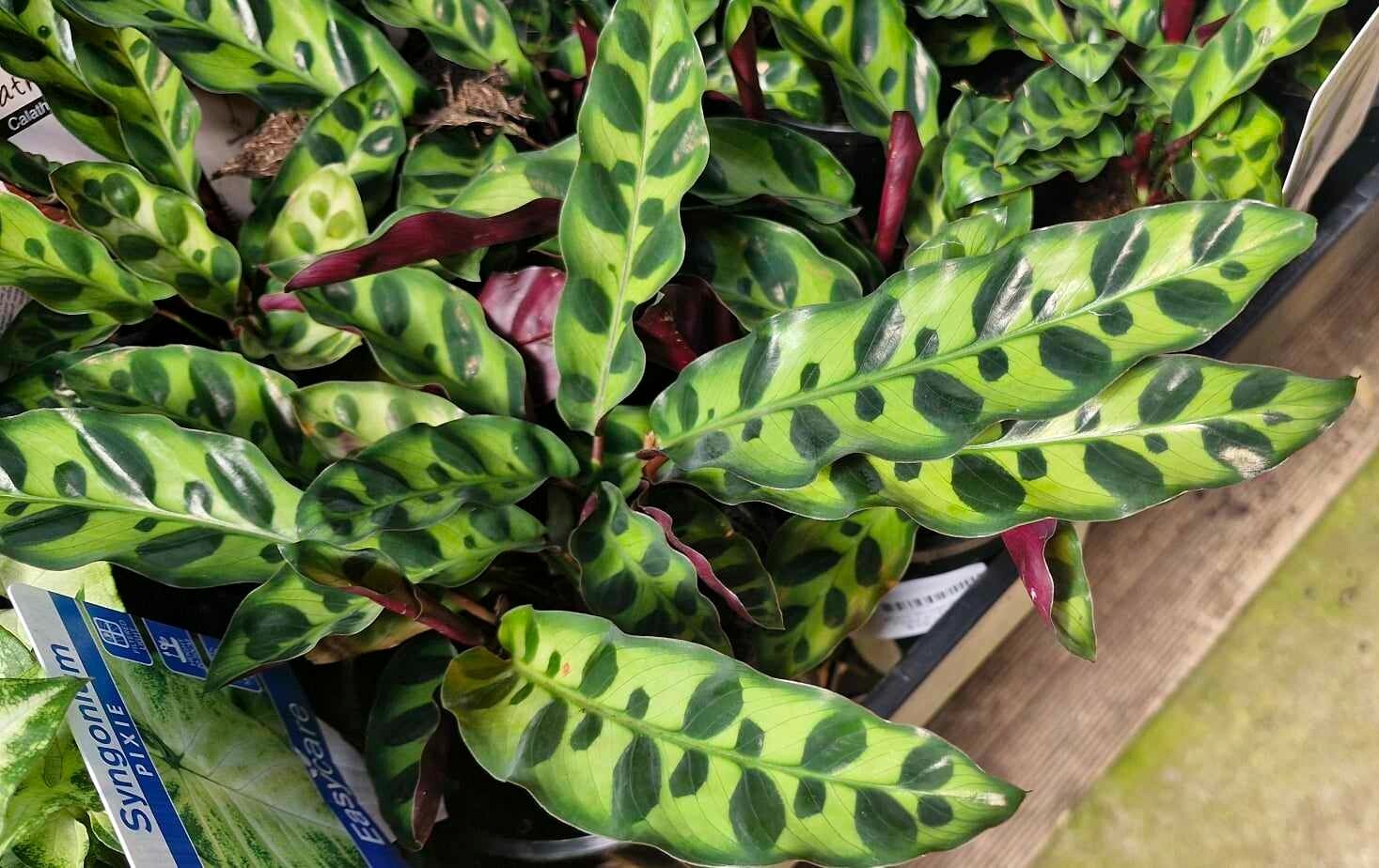 Rattlesnake Calathea is extremely popluar specimen for it’s striking resemblance of Snake skin with soft wavy edges, in variegated shades of lime and deep green, and deep purple lining at the bottom of the leaves. Requires filtered light or shade and a warm, humid position for best growing results.