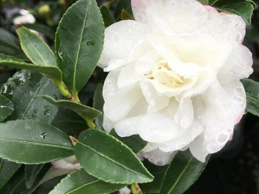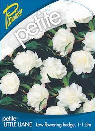 Camellia Paradise Petite Little Liane is a hardy, compact, evergreen shrub that reaches up to 1.5m tall. It shows small fluffy white buds that open in Autumn.