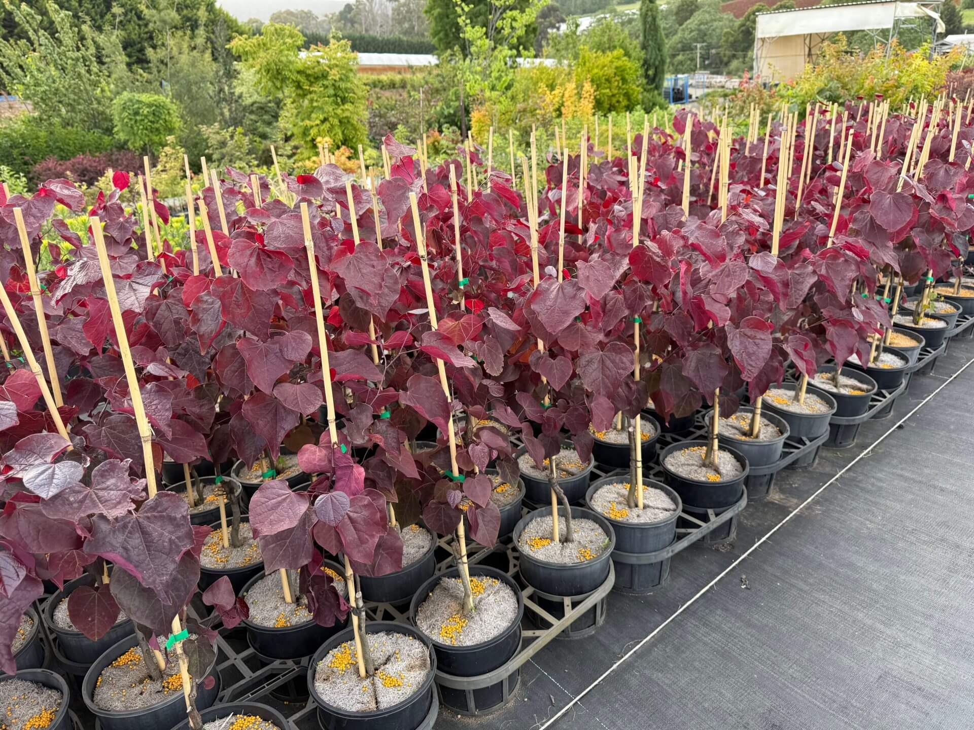 The Forest Pansy is an incredibly beautiful small growing deciduous tree. Its rich purple heart-shaped foliage turns vibrant yellows, oranges, reds and purples in the autumn time and in the spring its bare, almost black branches are aflush with magenta blossoms. It is an ideal feature shade tree for a lush suburban, cottage or Japanese style garden.