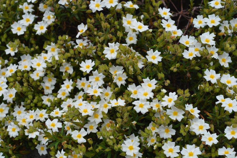 Sageleaf Rockrose (Gallipoli Rose) is a low spreading evergreen shrub with profuse snow-white flowers, adorned with golden-yellow stamens at their heart and a yellow spot at the base of their petals. Although each flower lasts only for a day, this vigorous shrub provides a succession of flowers for weeks in late spring to early summer. The blossoms are borne atop a dense mound of wrinkled, gray-green leaves resembling sage leaves, hence the common name. This plant is excellent for sloped areas or as groundcover for rough situations.