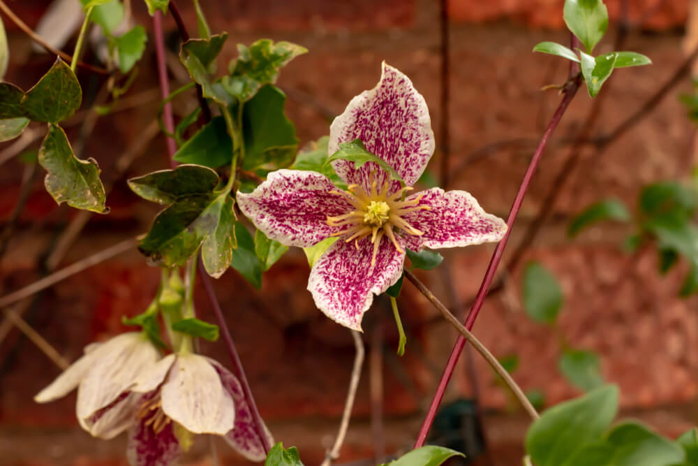 - Winter-flowering climber with creamy-white flowers marked with burgundy speckles.