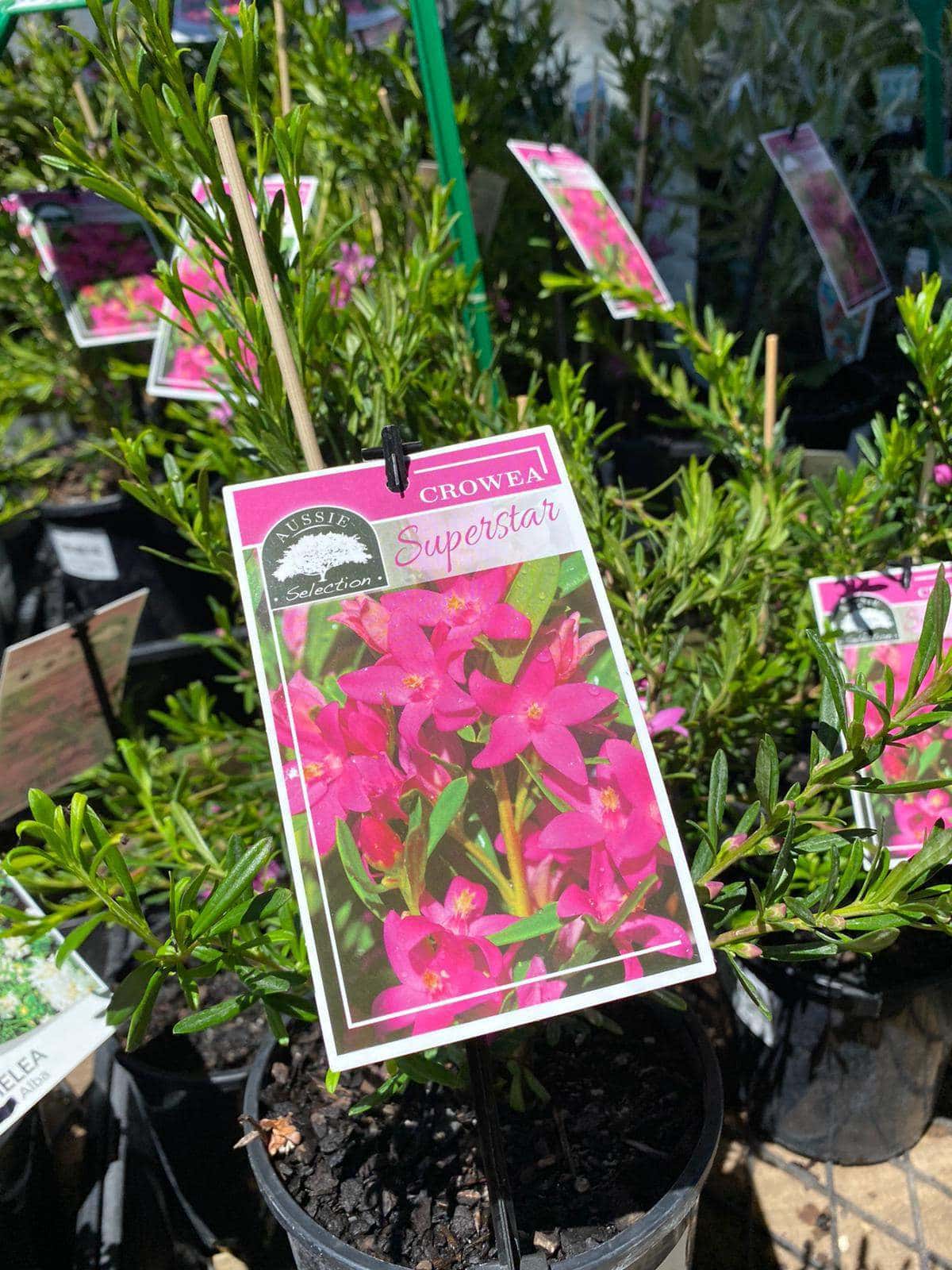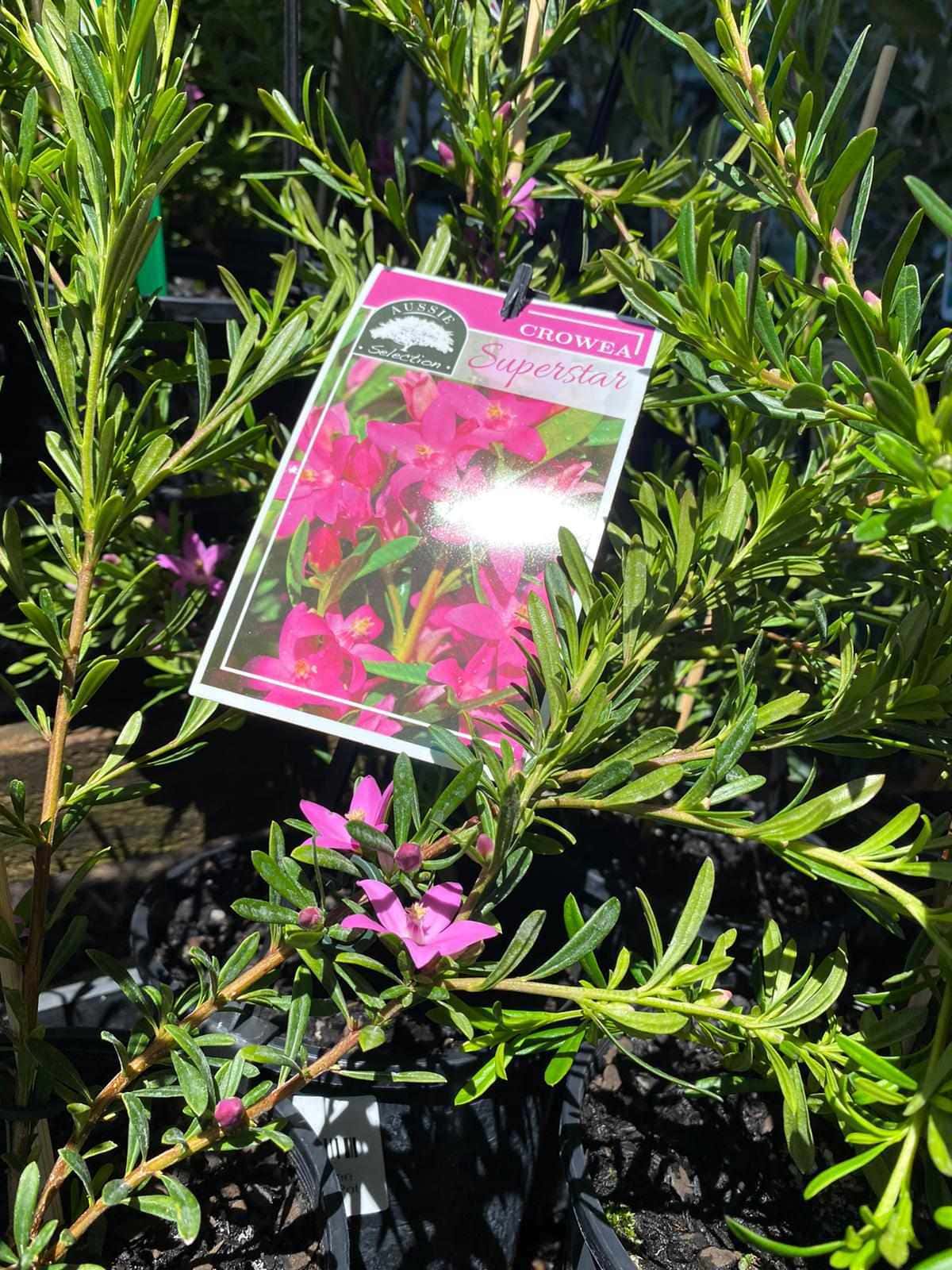 Crowea Mallee Superstar is a small shrub that grows up to a metre high. It has lance-shaped leaves and beautiful flowers that are 5-petalled and usually ranges from pale to mid pink in colour . The flowers are usually quite large with some forms having flowers up to 45 mm diameter. They are usually seen in late summer through to mid-winter.