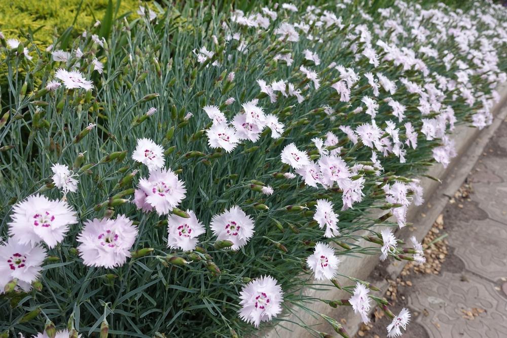 Carnation Kim brown displays masses of white blooms, with purple patchy centres. It is noted for its long flowering blooms held on sturdy stems. Drought tolerance, fragrance and exceptional hardiness are excellent features of this plant. Ideal for low hedging and borders. These look fantastic when mass-planted for ground cover.