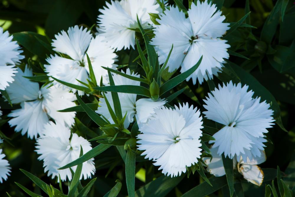 Carnation Mrs Sinkins shows masses of creamy white, double-petalled flowers, with grey-green foliage.
