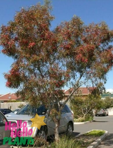 The Dwarf Yellow Gum (euky Dwarf) is a small tree with an open canopy, single trunk and smooth, shedding bark. It features green grey leaves, which are surrounded by pink/red flowers from Autumn to Summer.