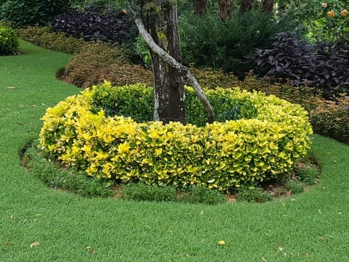 Golden Thumb Hedge is a lush evergreen, variegated small shrub.