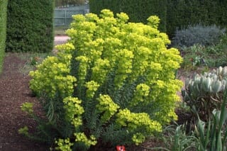 Smaller and neater growing than the more usually grown Euphorbia wulfenii, it has handsome blue-green foliage and long narrow columns of yellow-green flower heads. Sun. drought tolerant.