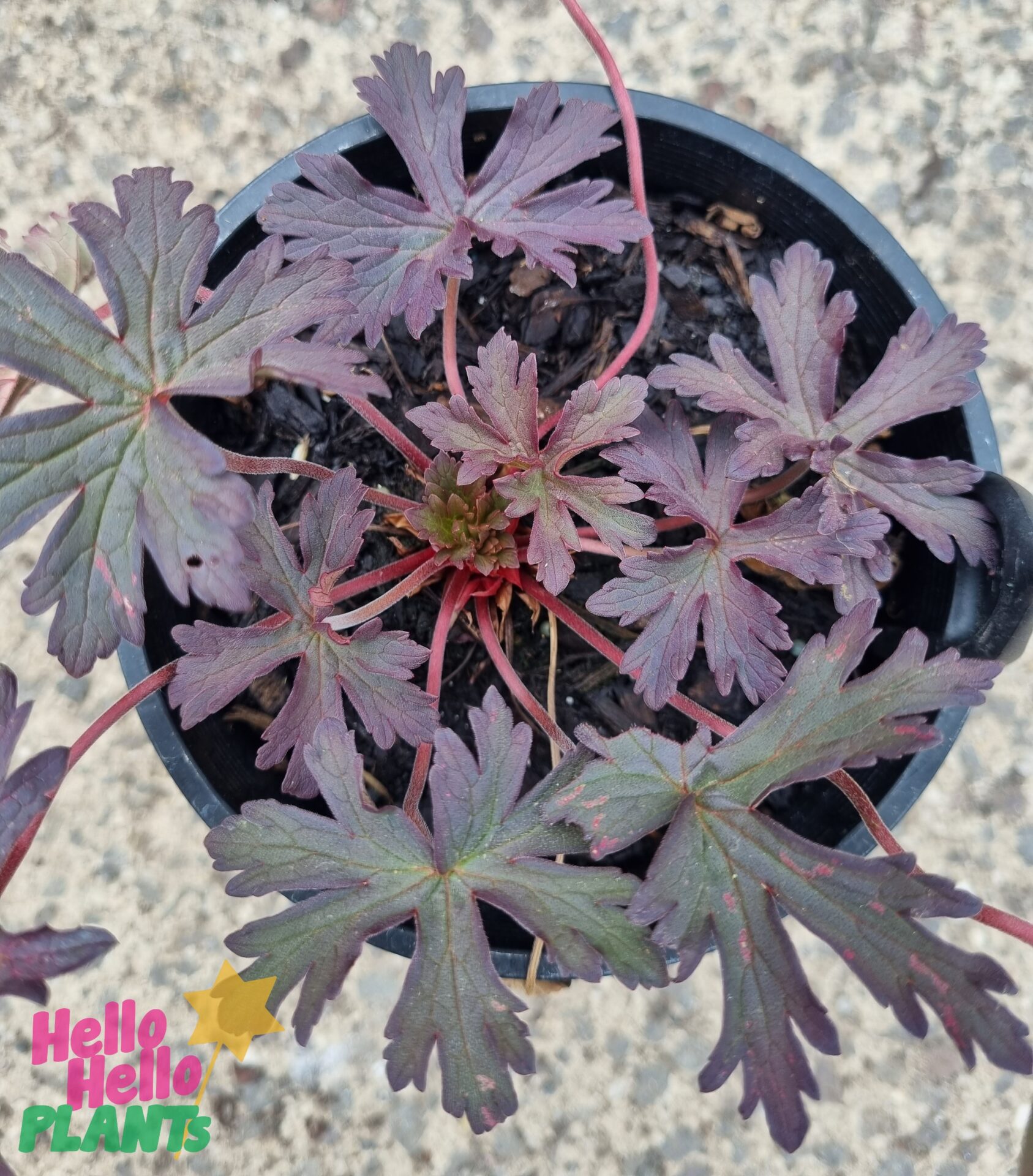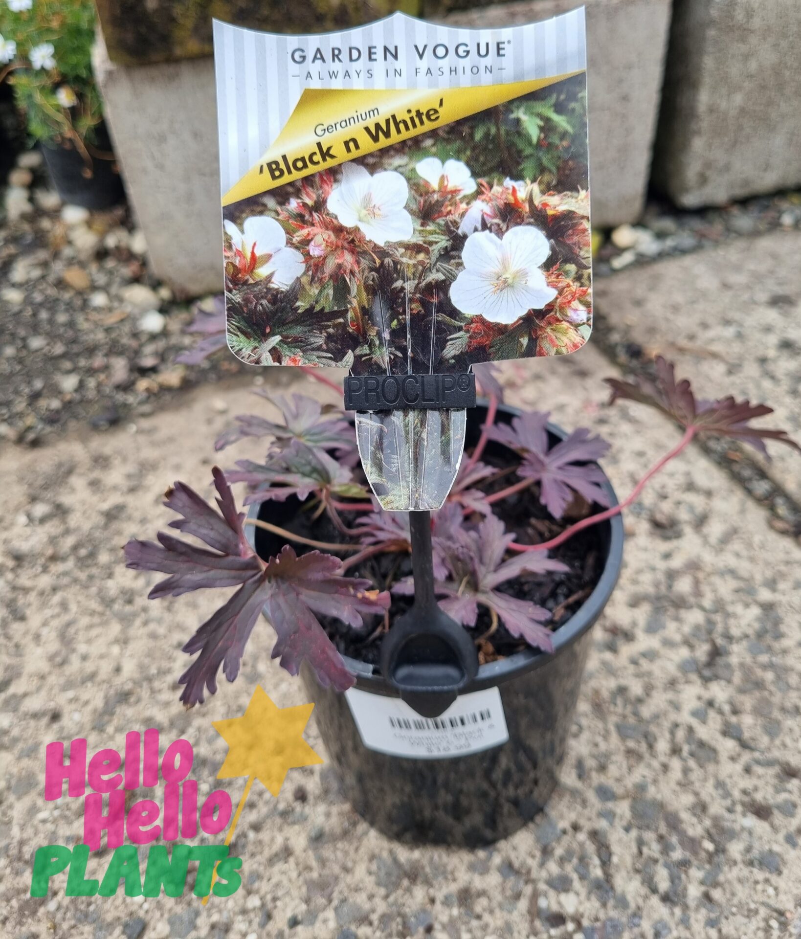 Geranium Black and White produces delicate white flowers with silver veins and brilliant purple-bronze foliage. Great for cottage-style gardens, borders, pots and containers. It will mature to 40x40cm.
