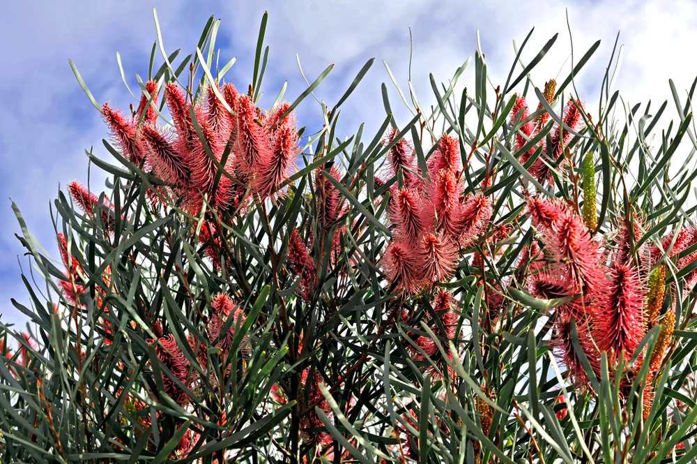 The vibrant blue-green foliage paired with striking pinkish-red flower spikes makes this medium-sized shrub from Western Australia a standout feature in any garden. Not only does it serve beautifully as a focal point outdoors, but its flowers also make lovely cut arrangements for indoor decor. To maintain its lush and compact appearance, a light trim after flowering is recommended. In the eastern states, you can often find this plant available as a grafted option, which enhances its growth in heavier soil types.