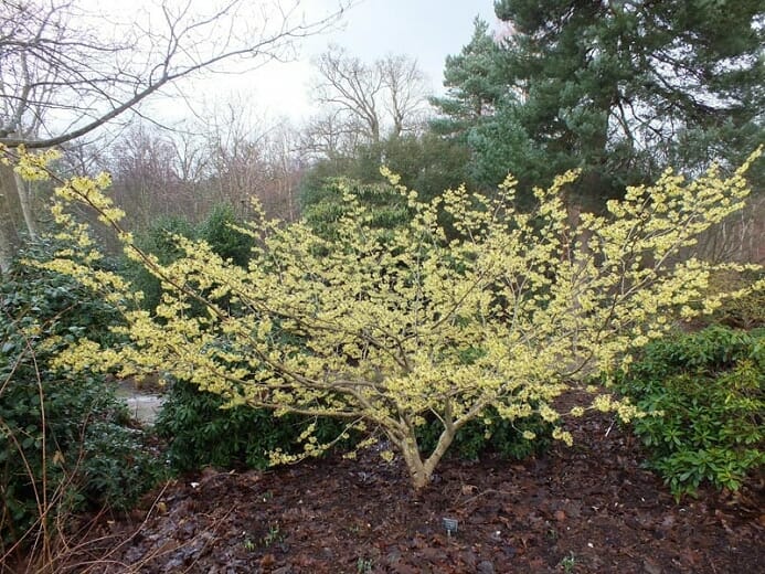 Considered one of the best of the witch hazels in terms of fragrance and delightful spider-like flowers during winter.  It has bright green leaves that turn yellow during autumn. The large flowers are sulphur-yellow, have crimped petals and stand out on the bare branches
