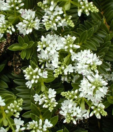 Hebe Buxifolia, also known as Box leaved Hebe is a small, round, bun shaped evergreen shrub with small glossy dark green leaves and small white flowers at the end of the branches. It is frost hardy and is a good cold climate plant, useful for shrubberies and for creating a low, flowering, informal hedge.