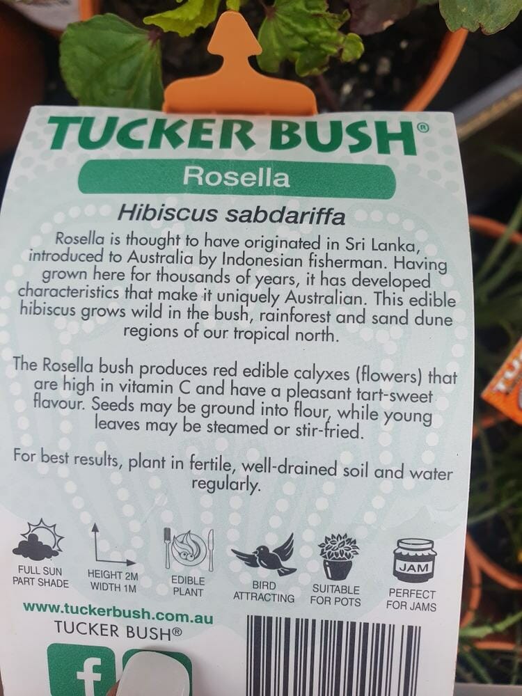 The Rosella bush produces red edible calyxes that are high in vitamin C. They have a pleasant tart-sweet flavour that goes well in salads, jellies, red sauces, jams, cordials, syrups, fruit teas and wine. Rosella is a hardy plant, adapted to a range of Australian climates. It can survive dry spells, but for best results, plant in fertile, well-drained soil and water regularly. Mature growth: 2x1m