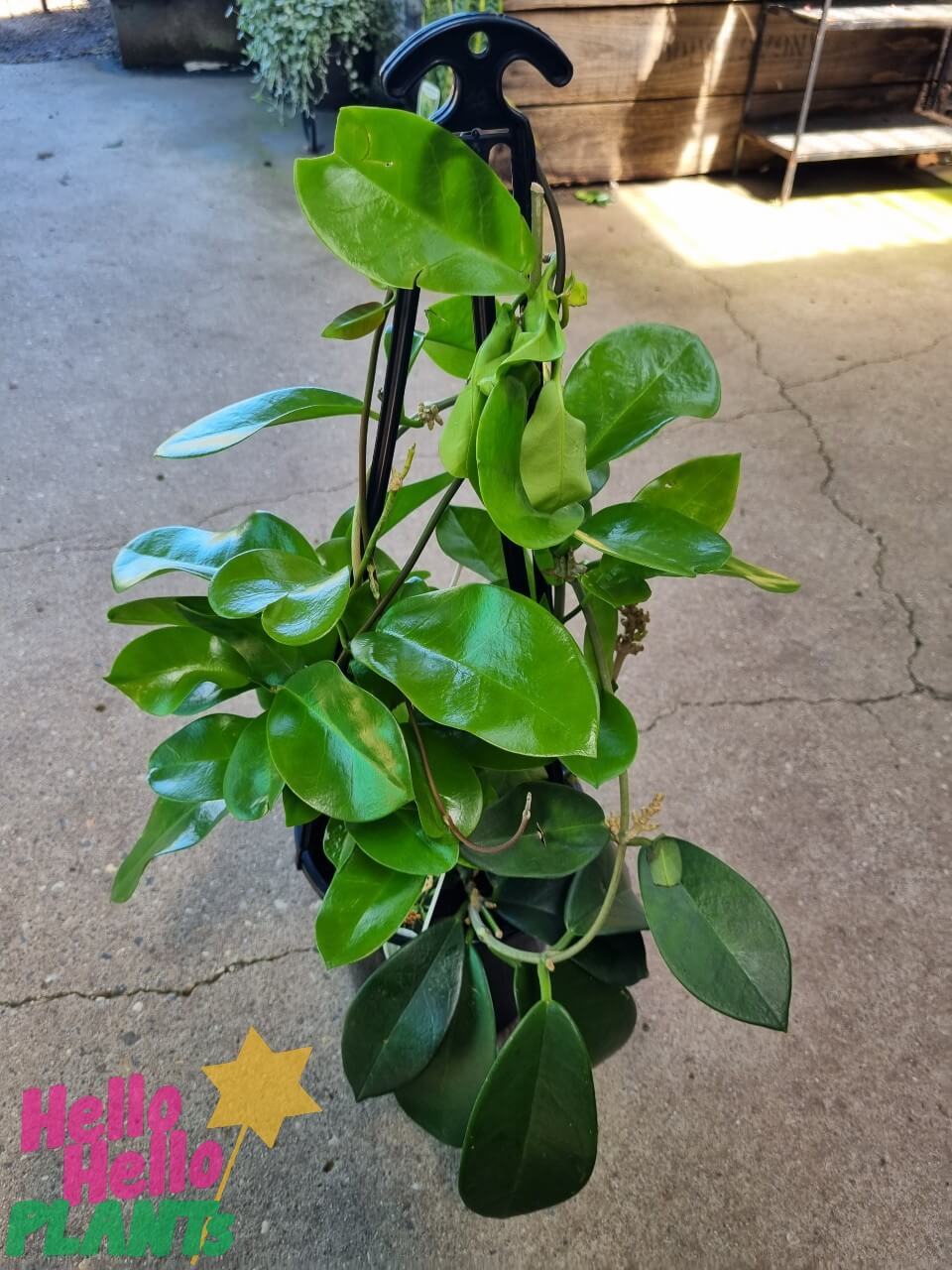 A tough, tropical climbing vine with glossy green succulent-like foliage and pink wax-like flowers. They prefer a lit position away from direct sunlight and a well-drained soil.