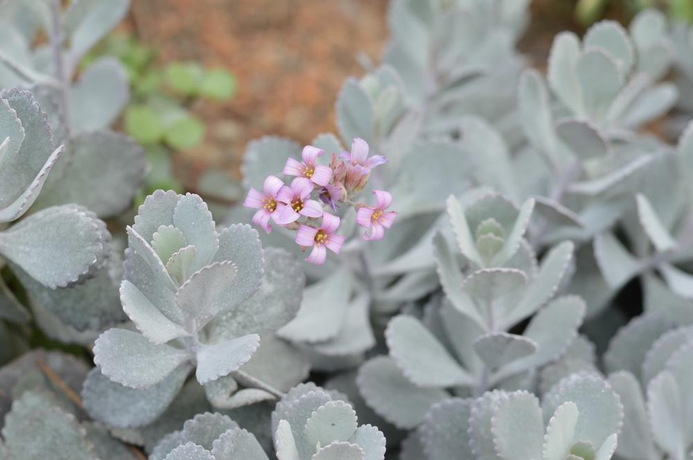Kalanchoe Quicksilver provides stunning grey/silver foliage all year round with purple tints and pink flowers from late winter, with almost no maintenance at all! Plant in full sun, loves the heat, in well-drained, rocky, sandy soil is fine. Mature growth 30cm x 60cm.
