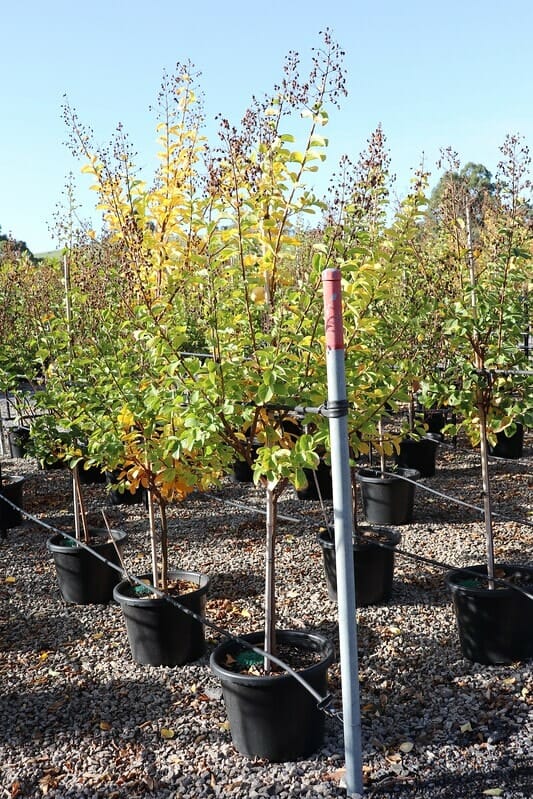 Pure white flowering Lagerstroemia that is covered in masses of crepe flowers in Summer. It has feature mottled bark that seems to twist with the branches. It can be a multi stem shrub or tree and trained to be a single leader street tree. Offers all round interest with red-orange Autumn tones and a smooth mottled bark. Grows approx. 6-8m tall x 5m wide.