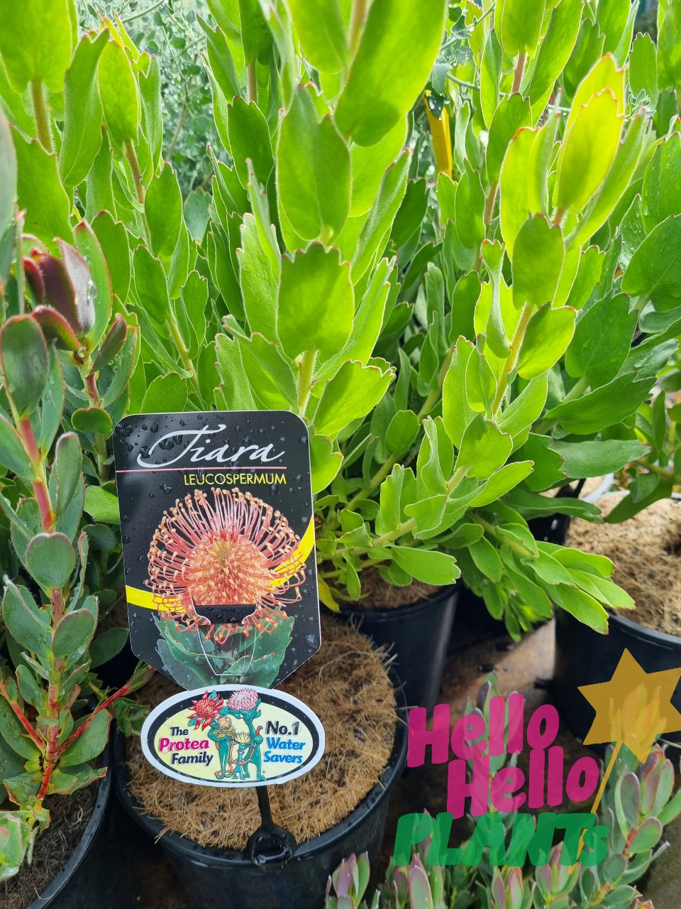 Tiara Leucospermum is a medium sized shrub reaching 2m with spectacular yellow and orange pin cushion flowers in Spring. Plant in well drained, acidic soils in a sunny position. Tiara is drought tolerant but may require water in the first summer of planting and in extremely dry conditions. Perfect for attracting wildlife and for cut flowers.
