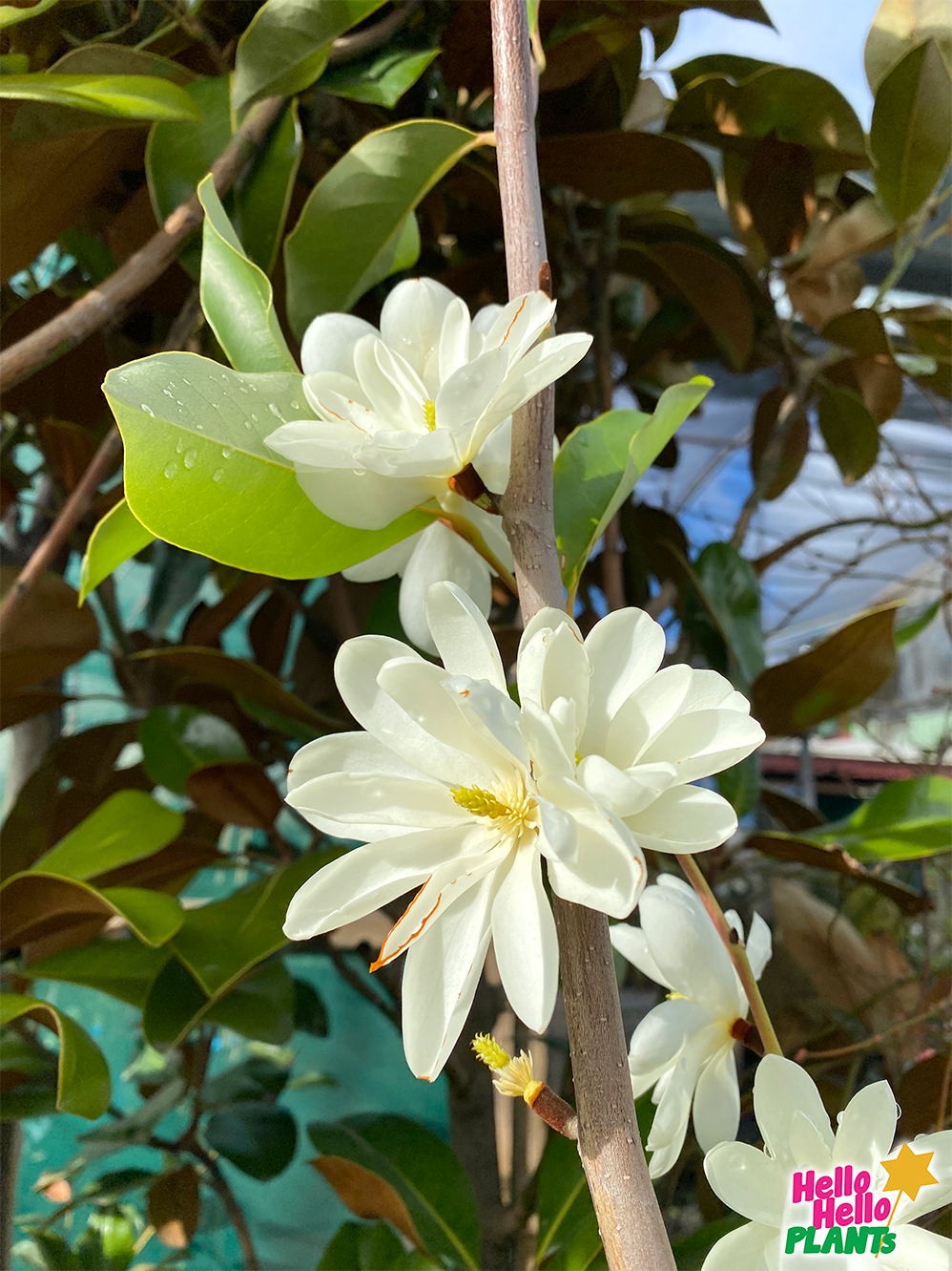 Superbly handsome evergreen feature tree. Masses of creamy white flowers with heavy perfume in Winter to early Spring. A vigorous growing Magnolia that has multiple flower buds at every leaf along the stem.