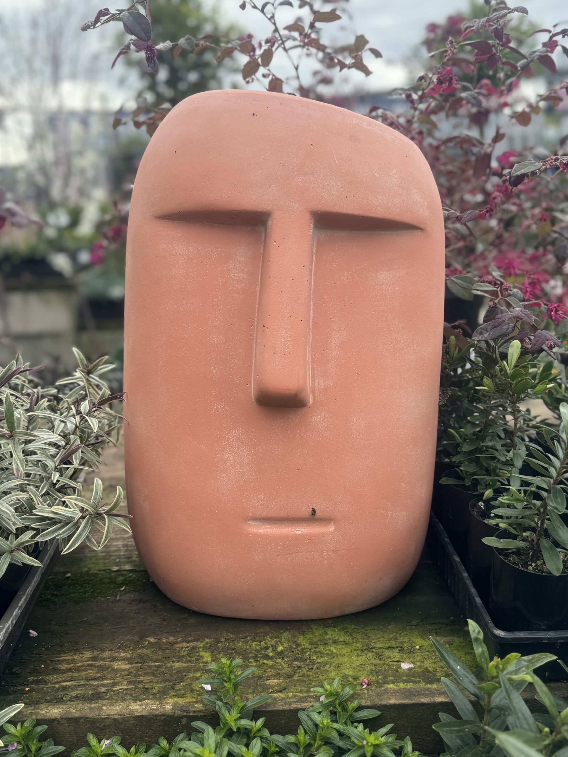 Decorative Moai Statue Terracotta for indoor and outdoor use, measuring 30x29x46cm, weight 8kgs. It is frost tolerant and waterproof.