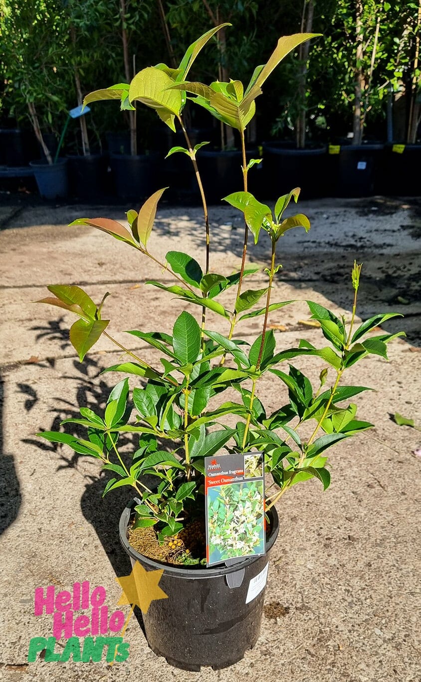 Sweet Osmanthus also known as fragrant tea olive (Fragrant tea tree), is an evergreen shrub with sweetly perfumed cream flowers traditionally used to flavour Chinese tea and sweets. We think it smells like peach yogurt! Suited to street planting, hedging and containers. Native to Asia, this gently scented flowering shrub has an upright growth habit and large evergreen foliage; clusters of tiny creamy-gold flowers.