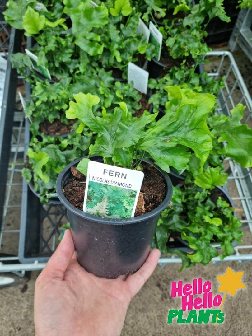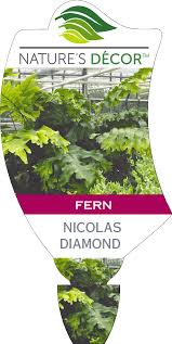 Nicholas Diamond Fern is a rare, herbaceous, tropical hybrid with upright to stems and deep green fronds that are wavy and curled. Spreads by creeping rhizomes. Use well drained moist soil and protect from bright direct sunlight.