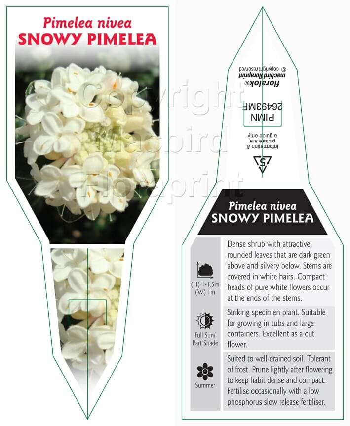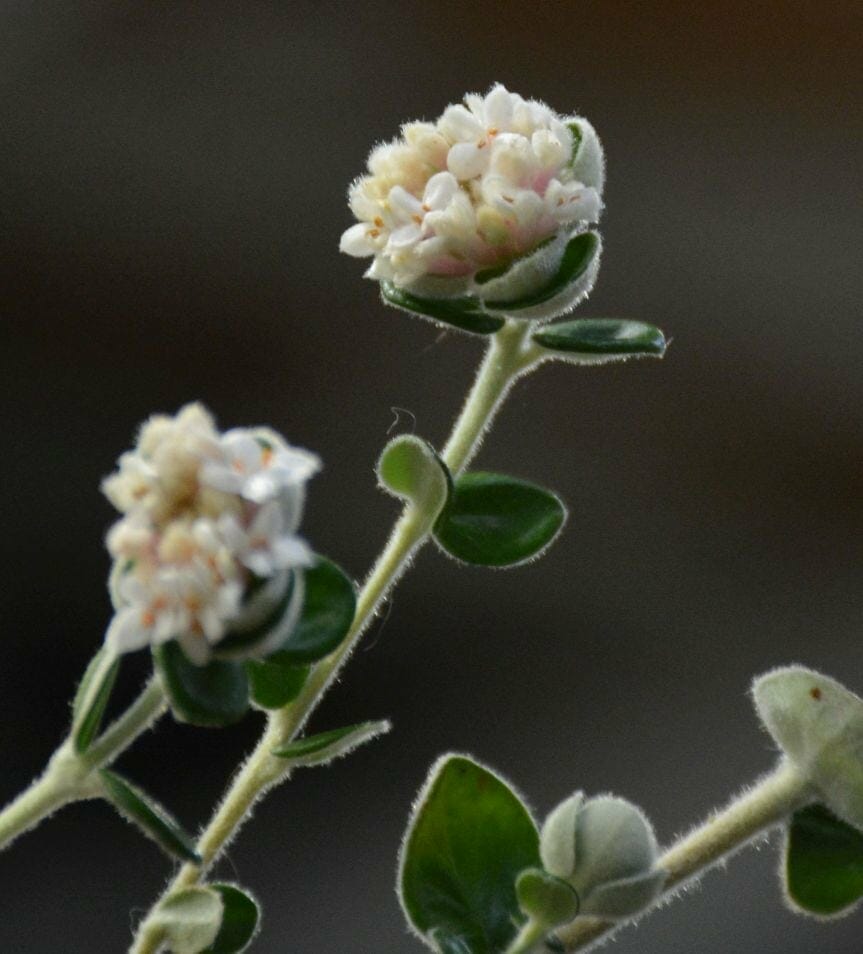 Pimelea nivea has attractive white or pink flowers, however the foliage is also a good addition to the garden. It has small rounded leaves, deep leathery, glossy green with a felty underside make this an attraction year round. Flowers in spring and summer, requires rich well drained soil, mature growth: 1.5m x 1m