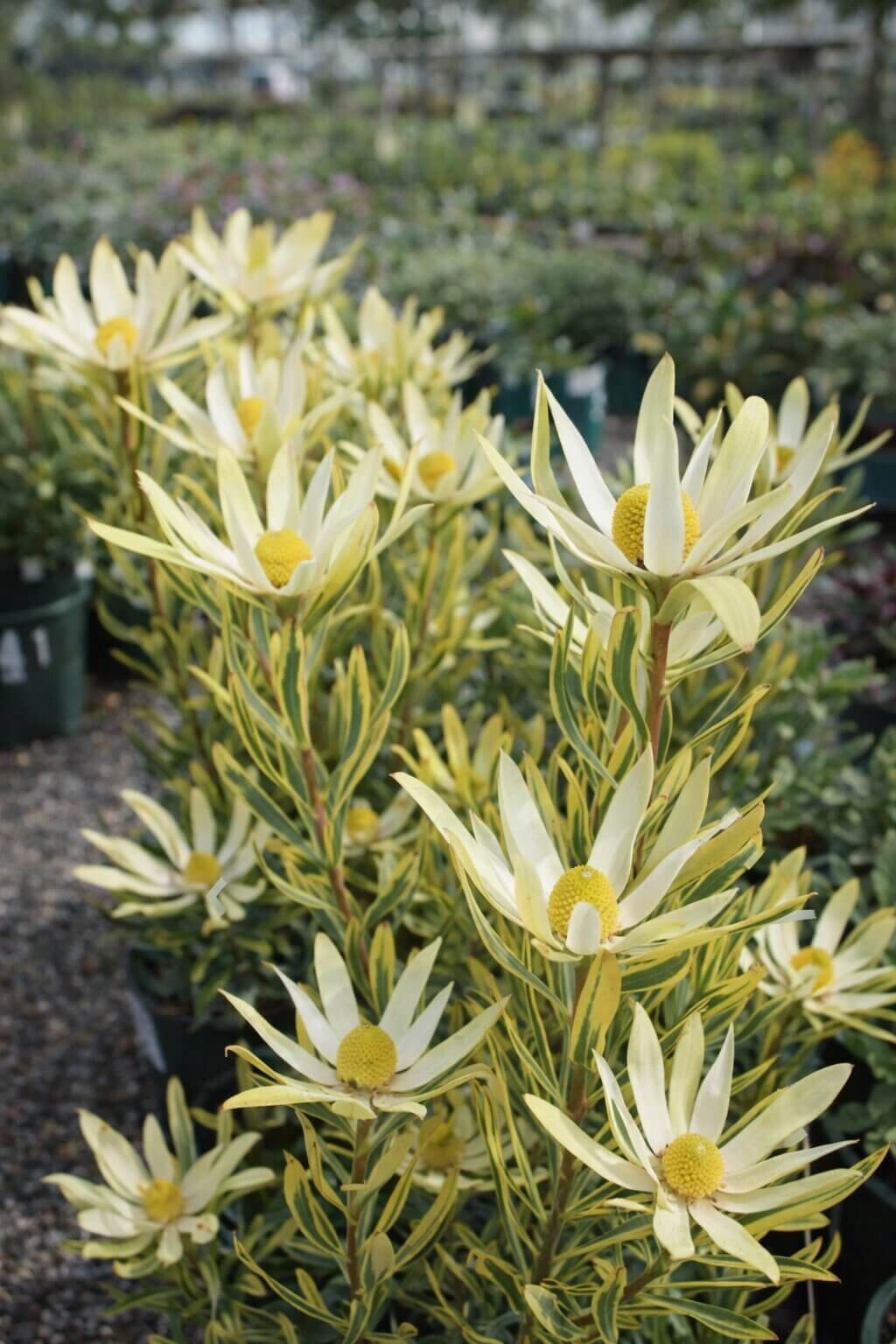 A medium-sized shrub growing up to 2.5 metres tall, featuring striking green and yellow variegated foliage. In spring, it produces beautiful yellow flower bracts that create a vibrant, eye-catching display.