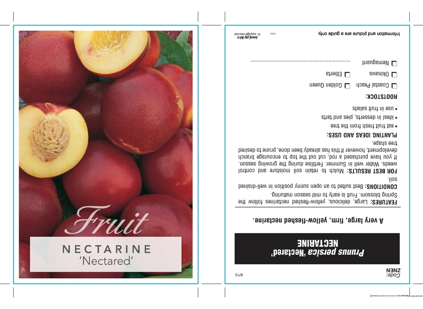 Considered a dwarf nectarine, Nectared is a two metre tall tree with large fruit that has bright red skin and firm yellow fine flesh, semi freestone with a very good sweet flavour, used for fresh eating as well as cooking.