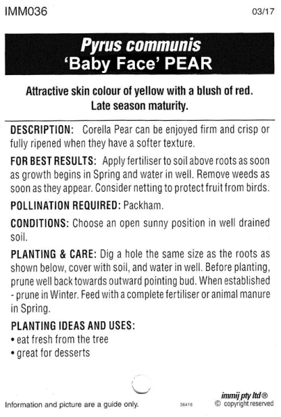 Baby Face fruiting Pear is a small cocktail pear known to be deliciously sweet and juicy with green and red skin. Plant in a full sun position with well drained soil. Water in well and keep soil moist until tree is established.