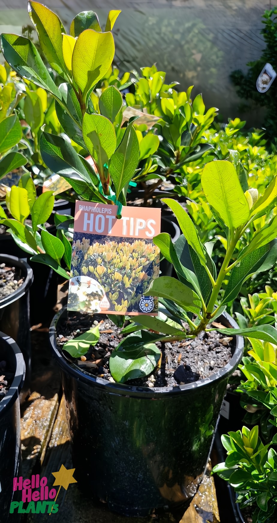 Hot Tips Indian Hawthorn is a fresh new variety with green foliage and bright orange and red tips from early winter. The flowers are small and white that arise from spring. It is frost and drought tolerant when established. Plant in full sun to part shade. Mature growth: 1x1m.