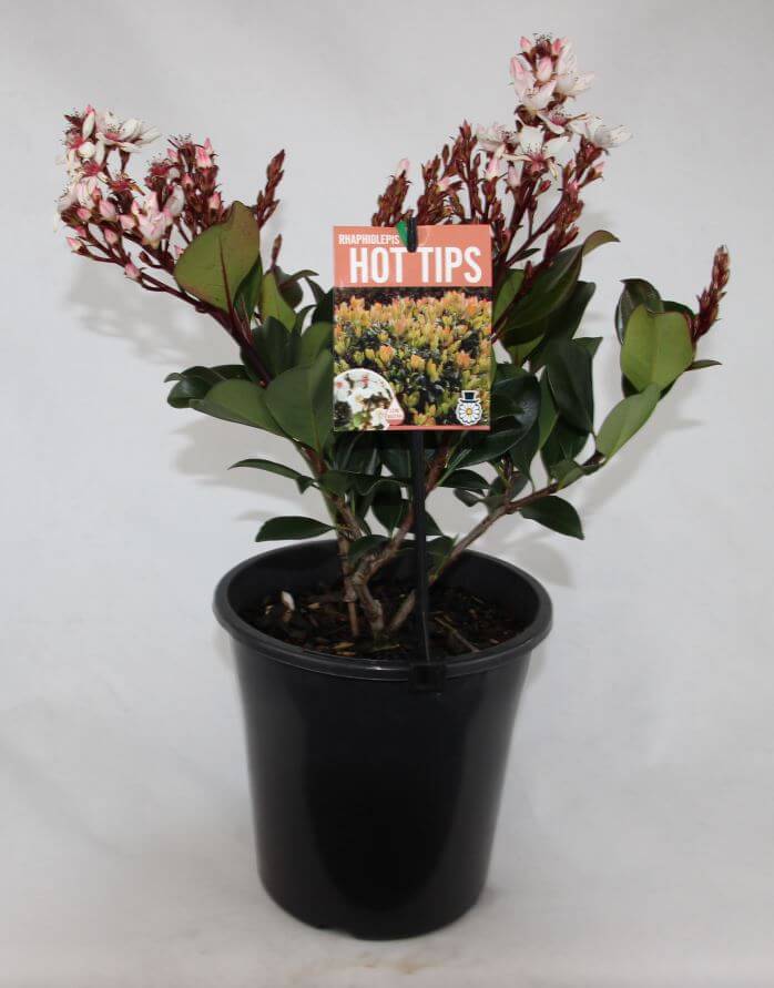 Hot Tips Indian Hawthorn is a fresh new variety with green foliage and bright orange and red tips from early winter. The flowers are small and white that arise from spring. It is frost and drought tolerant when established. Plant in full sun to part shade. Mature growth: 1x1m.