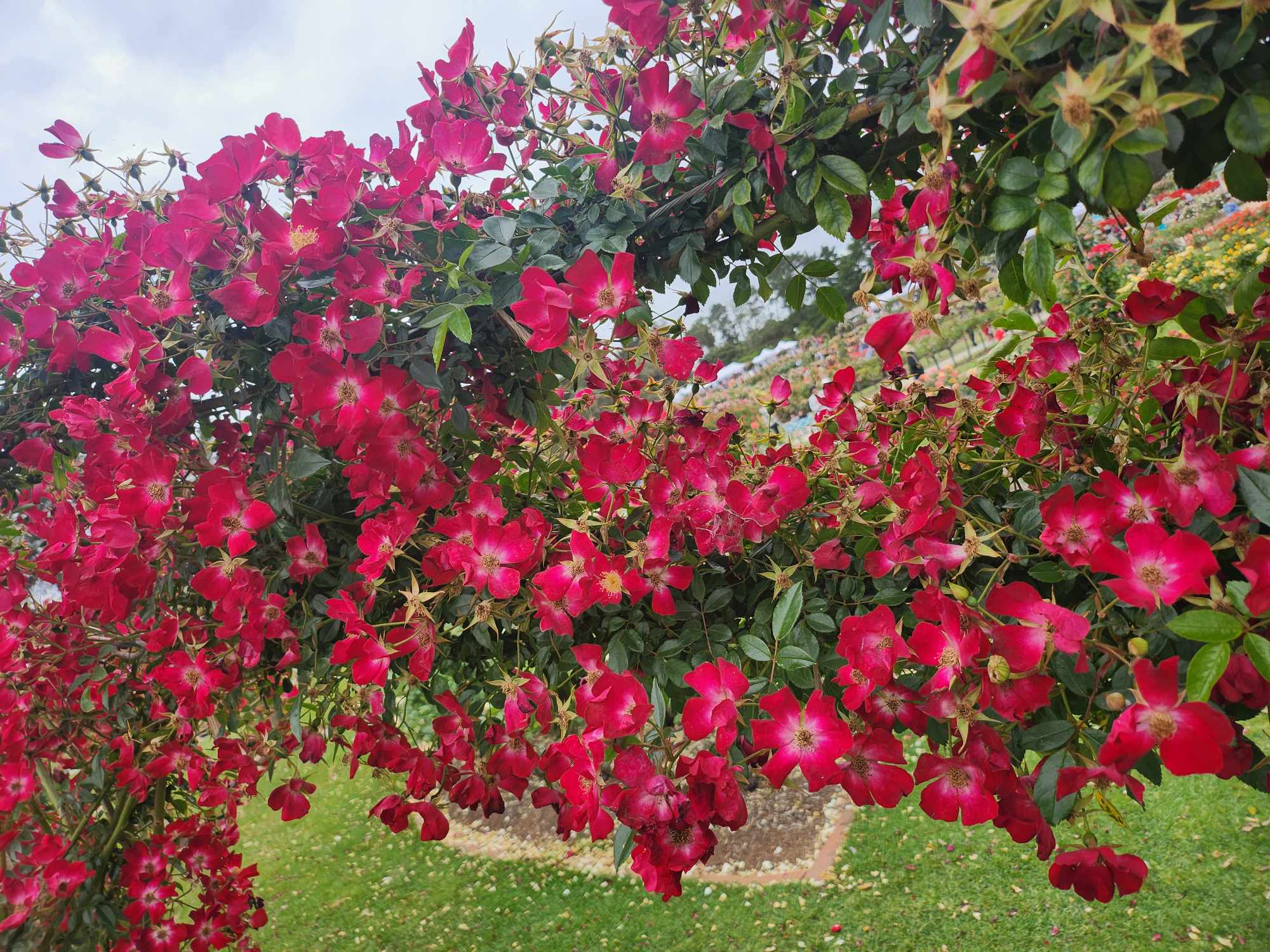 Bloomfield Courage roses have?clusters of small, single dark red blooms with pale centers and only mild fragrance.