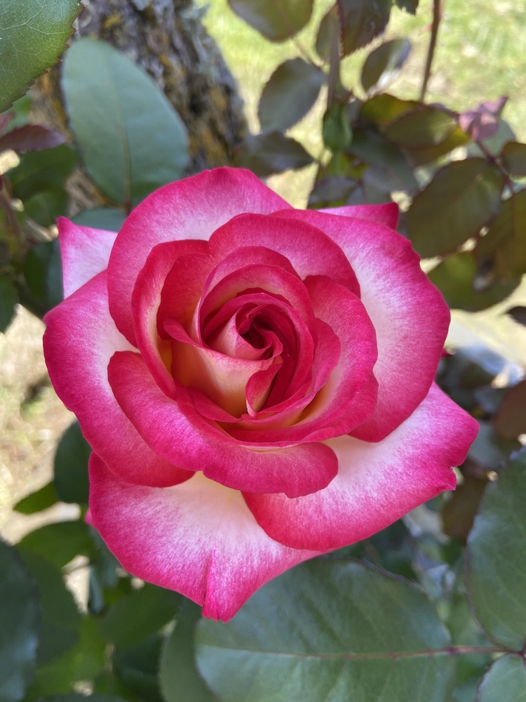 Upright growth reaching 75cm, featuring dark green glossy leaves that exhibit resistance to diseases. The blooms are medium to large, comprising a mix of hot pink, red, and white.