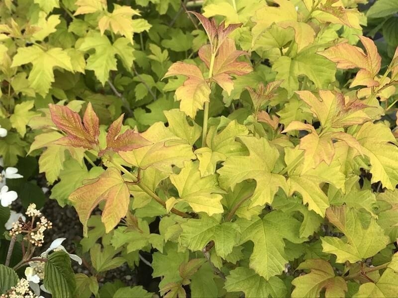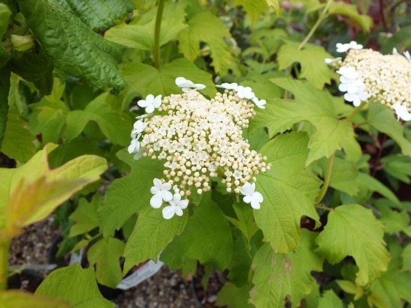 Aureum is a vigorous, bushy deciduous shrub with maple like, 3-lobed, bright yellow leaves and flat clusters of small white flowers surrounded by larger sterile flowers, in early summer, followed by red berries. Mature growth: 4x4m
